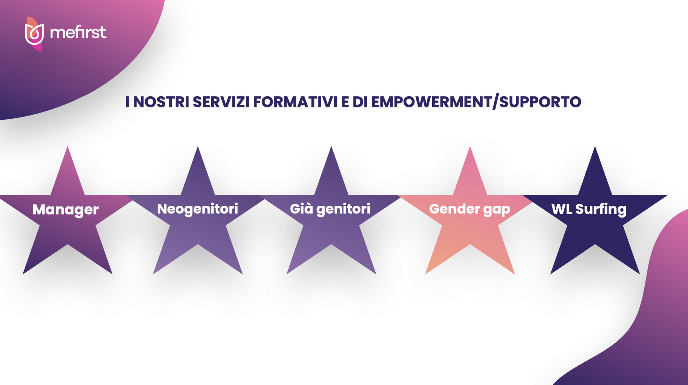 I nostri servizi riguardano percorsi di training formativi e di empowerment psicogico, piattaforme digitali e materiali editoriali a supporto dei programmi e target diversi. Ci occupiamo di neo genitorialità e di supporto alla transizione individuo-genitore, ma anche di genitori wish to be, genitori maturi e prima ancora dei genitori ci occupiamo di formare i e le manager di tutti i livelli in azienda. Il nostro kick-off Manager First mette le basi per un reale cambiamento culturale. Infine il work-life-surfing, il nostro modello di equilibrio vita-lavoro-accudimento che piace anche ai non genitori e spesso eroghiamo a tutta la popolazione aziendale.