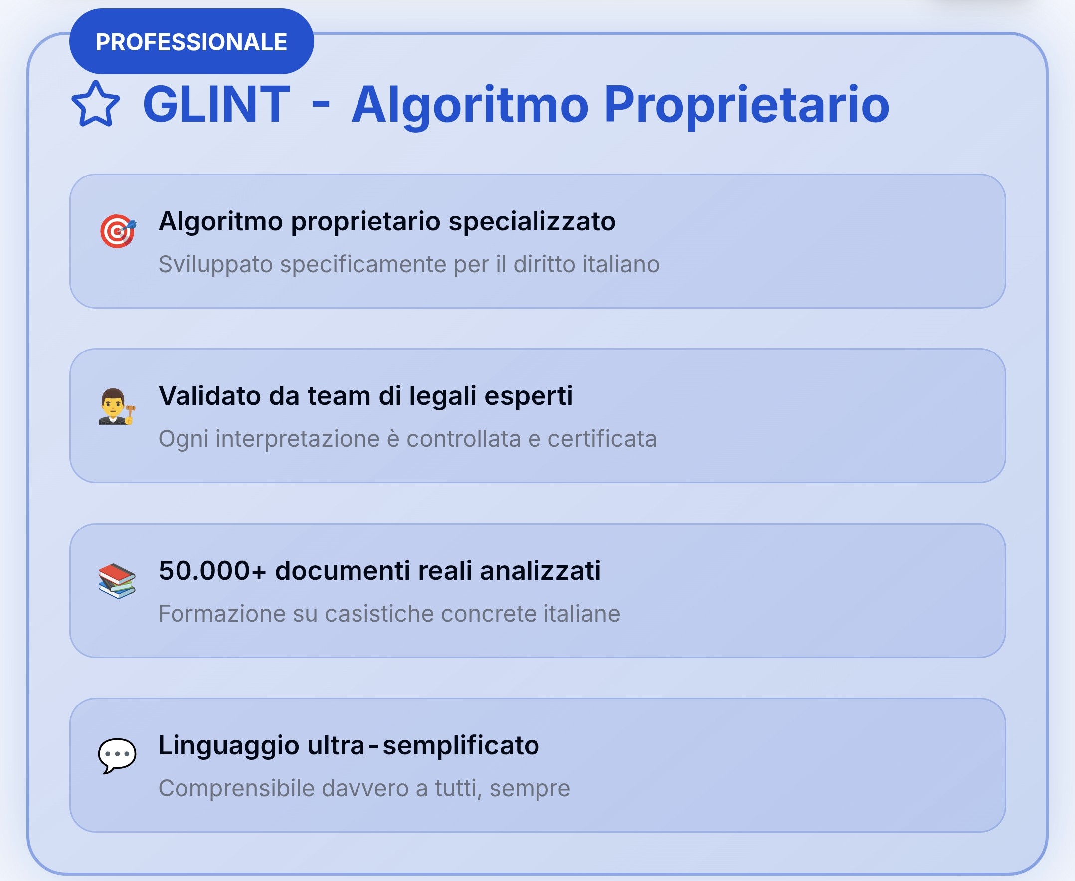 GLINT è la piattaforma gratuita che rende comprensibili, a tutti, contratti e documenti complessi. Il linguaggio legale finalmente comprensibile. Ogni giorno milioni di persone si trovano di fronte a documenti legali incomprensibili. Contratti, policy, regolamenti che dovrebbero informare, ma finiscono per escludere e confondere. Il 77% delle persone non comprende contratti e policy. 45min è il tempo medio per leggere un semplice documento giuridico . Il 90% delle persone NON fa domande prima di firmare documenti importanti GLINT si adatta al tuo modo di interagire: usa gli occhiali smart per analizzare documenti in tempo reale, carica i tuoi testi per analisi dettagliate, o interagisci con la voce per domande immediate. Carica documenti: ti è arrivato un contratto telefonico, una polizza auto, i documenti per il mutuo della casa o un contratto di lavoro? Carica il documento sull’app e in 40 secondi avrai tutto chiaro: costi, penali, clausole importanti e diritti. Comando vocale: stai per firmare un documento importante e non sai a chi chiedere informazioni? Apri l’app e domandaci: “Cosa succede se disdico il contratto in anticipo?” oppure “Che garanzie ho se il prodotto si rompe?”. Avrai risposte immediate con riferimenti specifici. Occhiali smart: stai noleggiando un’auto e vuoi capire le clausole sulla franchigia dell’assicurazione? Se hai degli occhiali smart (es. Ray-Ban Meta, Xiaomi) inquadri il contratto e ricevi spiegazioni vocali immediate su coperture, limitazioni e costi. Discreto, veloce, preciso. Non usiamo intelligenze artificiali standard. Il nostro algoritmo proprietario è stato sviluppato e validato da team di legali esperti per garantire precisione e affidabilità. Il diritto dovrebbe essere per tutti, non per pochi. Se firmi, devi capire. Se capisci, decidi meglio. Se decidi meglio, vivi meglio.