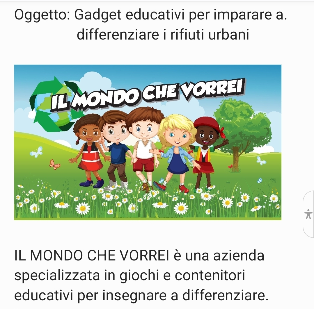 In un mondo digitale propongo una startup tutta analogica che insegna a fare la raccolta differenziata. La raccolta differenziata è un problema mondiale non ancora affrontato nel modo corretto. Infatti nel mondo non c’è una educazione univoca, una lingua universale che ci porti ad acquisire le regole basilari per affrontare il problema e non serve , in questo caso muovere solo i polpastrelli delle nostre mani. Servono movimenti di tutto il corpo. Attraverso l’educazione alla raccolta differenziata insegniamo anche gioia di vivere, felicità, fratellanza tra i popoli, rapporti inteumani , rispetto per la natura, matematica, lingue etc.